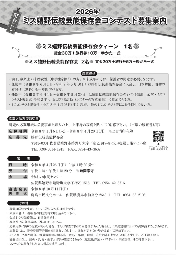 ・嬉野伝統芸能保存会ミスコンテスト募集のご案内